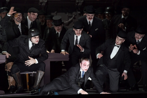 | Gary Griffiths (Kreon; in der Bildmitte stehend) und Peter Marsh (Ödipus; darüber) sowie Ensemble (c) Barbara Aumüller |